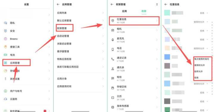 打开手机中的【设置】,找到【应用管理】选项,然后选择【权限管理】,进入之后,点击【位置信息】,就可以看到所有应用的位置权限情况了,把不经常用的软件权限更改为【拒绝】即可。