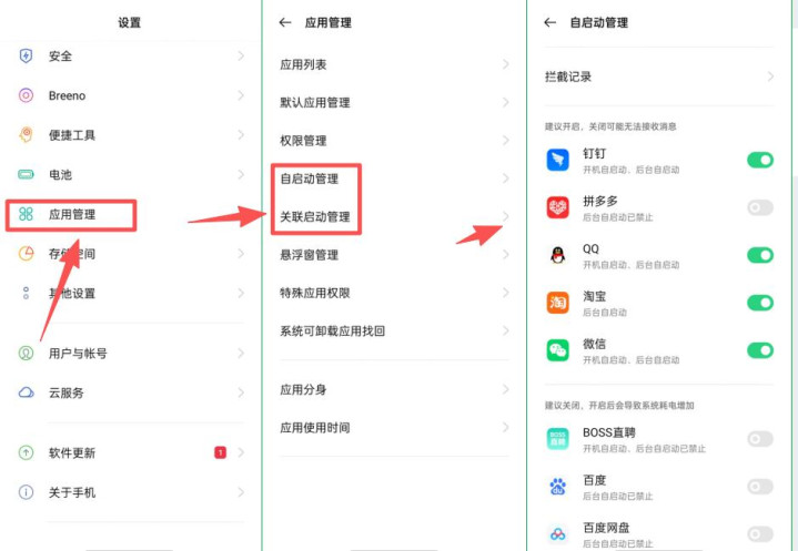 打开手机中的【设置】,找到【应用管理】选项,进入之后,就可以看到【自启动管理】和【关联启动管理】,把不经学用的软件关闭,注意把经常用的留下,不然会收不到消息。