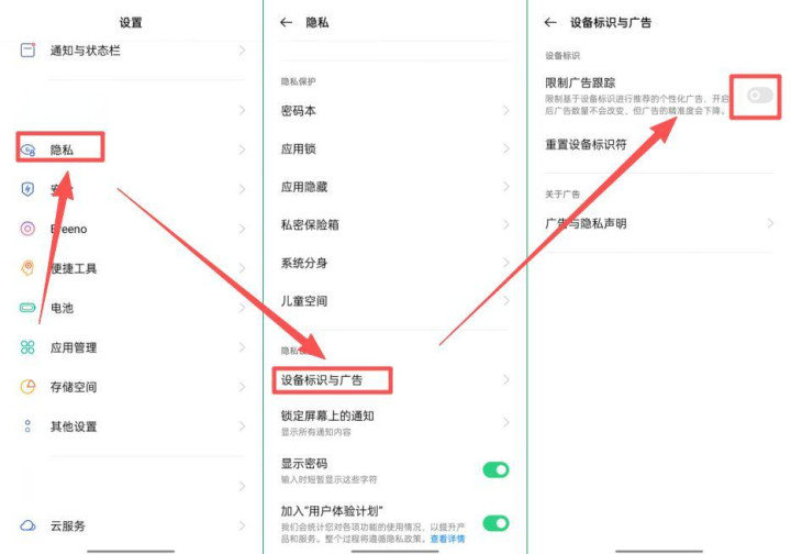 打开手机中的【设置】,找到【隐私】选项,在下面可以看到【设备标识 与广告】,点击它,进入之后,可以看到【限制广告跟踪】,把它打开,有的手机是关闭,注意区分。